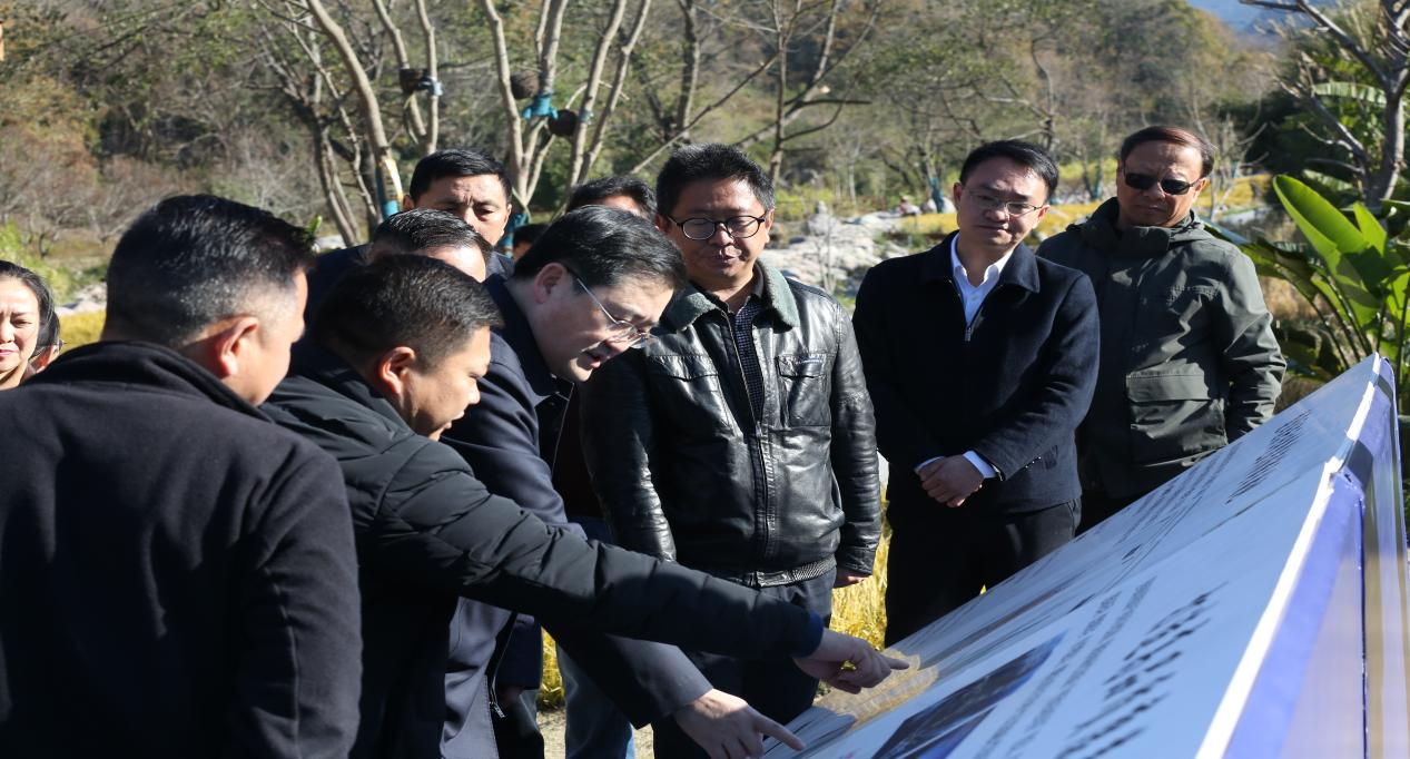 在项目规划展示牌前,刘常委仔细聆听了德昌旅游资源规划分布和海花沟项目区位及各产业规划情况的介绍。