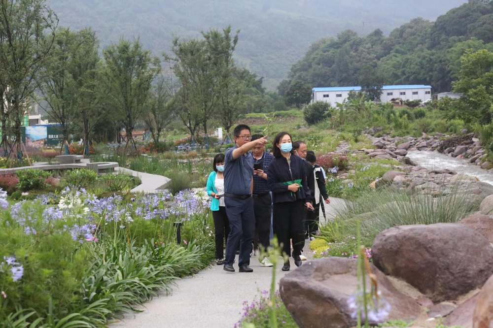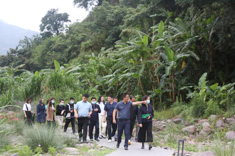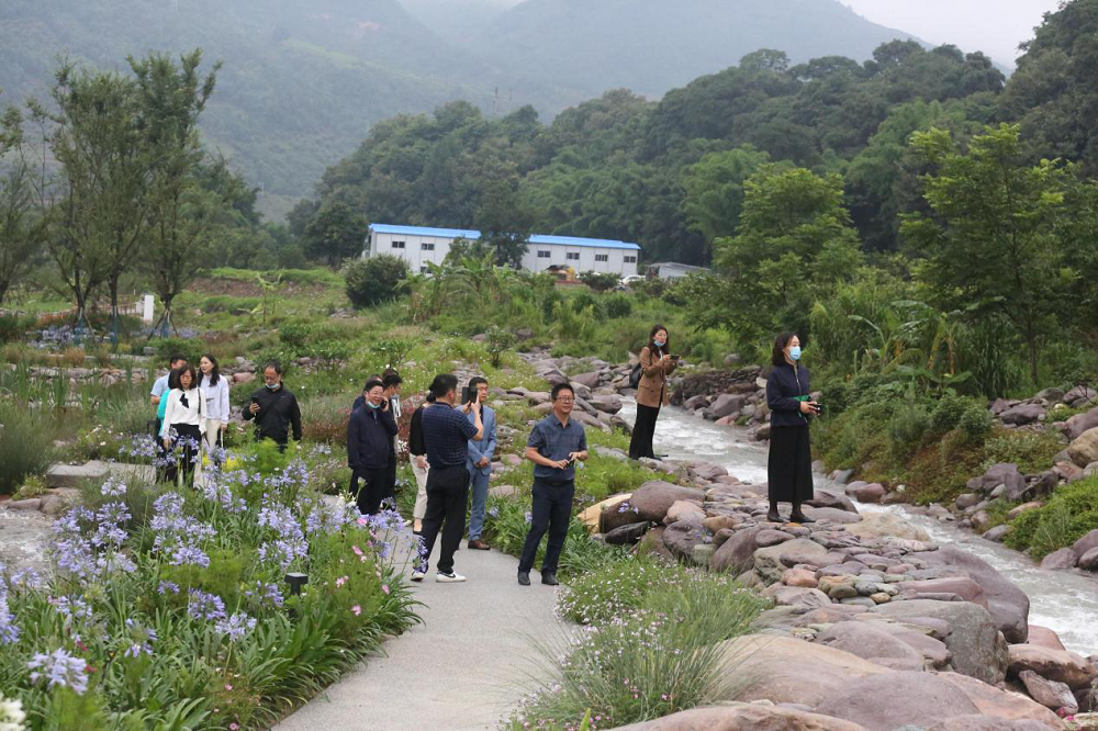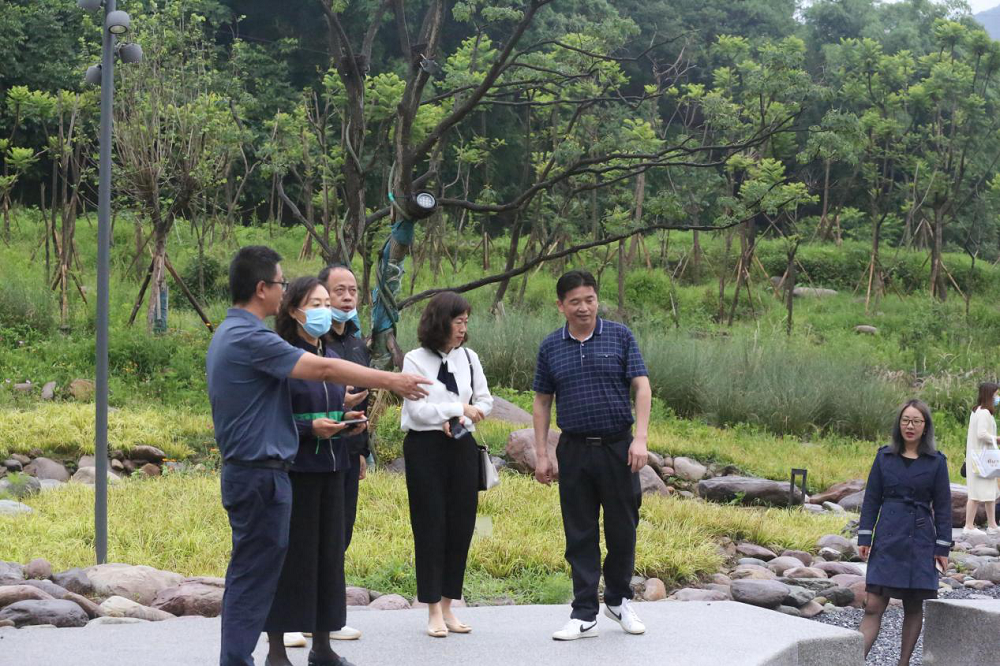 走进海花沟大地公园,在这海天一色的美景下,满园的花繁草茂,公园里溪流旋转,叮咚作响,时刻冲击人们的视觉与听觉。期间李总向客人们介绍了海花沟项目之前的地势地貌及原有的景观特色。